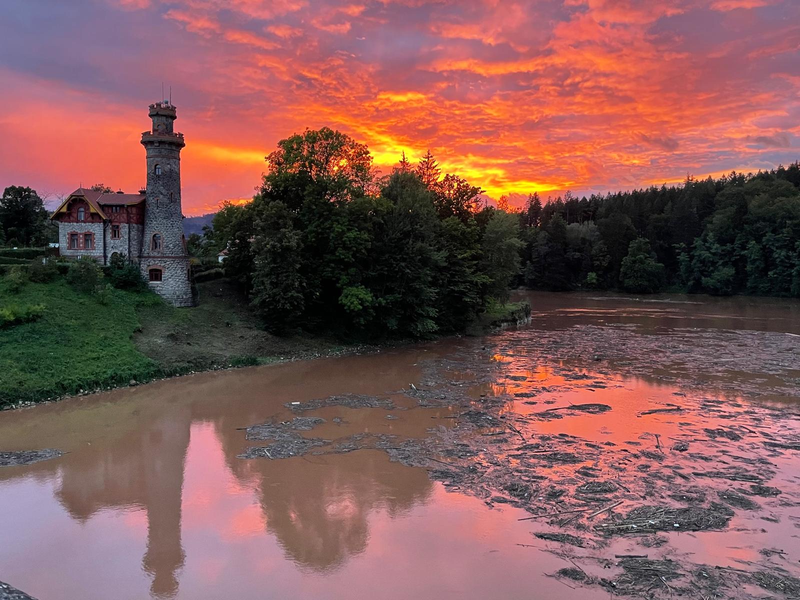 Fotografie večerní situace na řece Labi na území Královédvorska (přehrada Les Království, Vestřev)povodne 14 9 vecer prehrada zapad RB.JPG